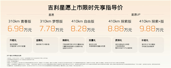 近日,吉利汽车集团正式宣布几何系列并入银河,首款A0级纯电小车吉利星愿正式上市。新车共推出星愿和星愿UP两个系列共5个版型,售价区间6.98万元-9.88万元。