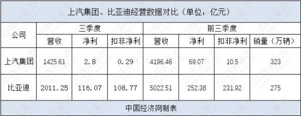 第三季度,上汽集团营业收入为142,5.6亿元,同比下滑25.58%;净利润2.8亿元,下滑93.53%;扣非净利润更仅有2916.6万元,下滑99.23%。综合前三季度,公司营业收入4196.5亿元,下滑17.39%;净利润69.1亿元,下滑39.45%;扣非净利润10.5亿元,下滑88.92%。
