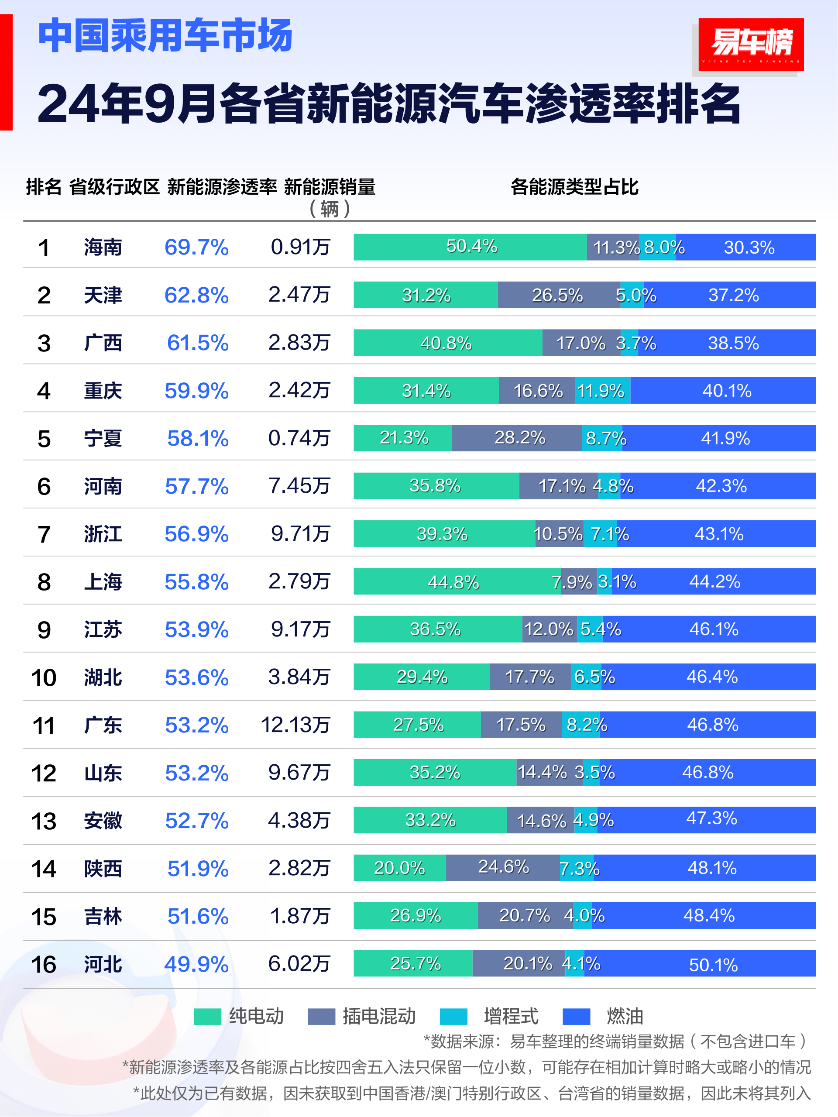 中国经济网北京12月12日讯 汽车平台易车整理的终端销量数据(不包含进口车)显示,9月省级行政区新能源渗透率前3名分别为:海南省、天津市、广西壮族自治区,稳居第二名的天津市新能源渗透率已达到62.8%。