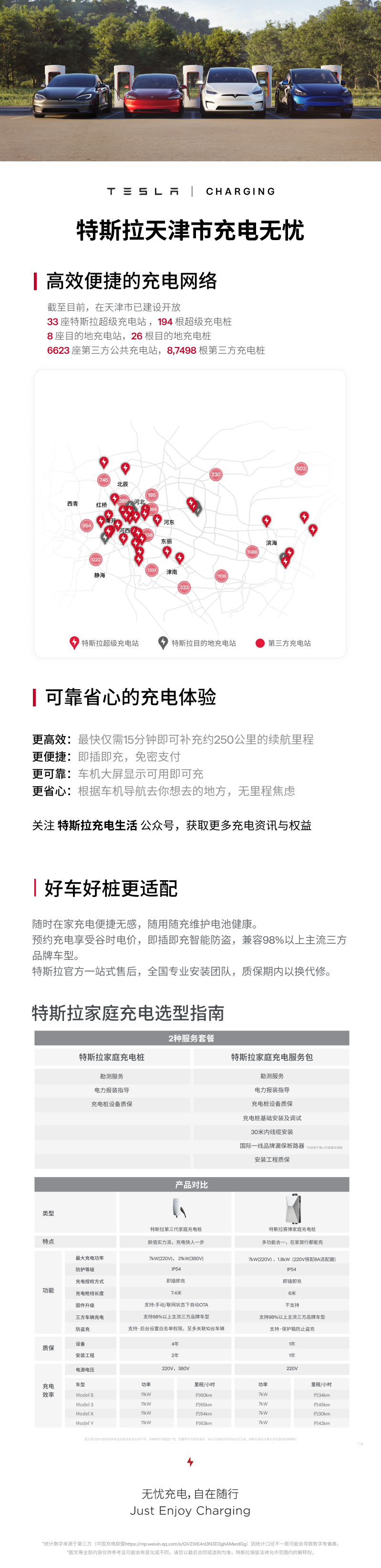 在政府加大力度推进充电基础设施建设的号召下,汽车企业和第三方充电企业也加大在天津的投资布局。新能源汽车代表企业特斯拉介绍,截至目前,特斯拉已在天津市建设开放33座超级充电站,194根超级充电桩,8座目的地充电站,26根目的地充电桩。截至目前,特斯拉在中国大陆已布局2000多座超级充电站、11500多个超级充电桩。