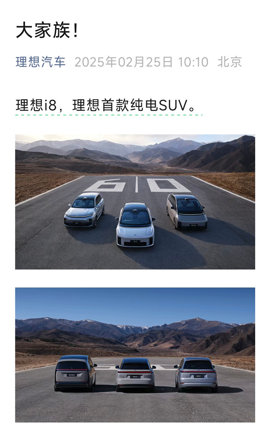 2月25日,理想汽车正式发布首款纯电SUV——理想i8的官方图片,展示了新车的前脸与尾部设计。据悉,i系列作为理想汽车全新打造的纯电SUV系列,将与现有的L系列(增程式)、MEGA(纯电MPV)并驾齐驱,共同构建理想汽车产品矩阵“大家族”。
