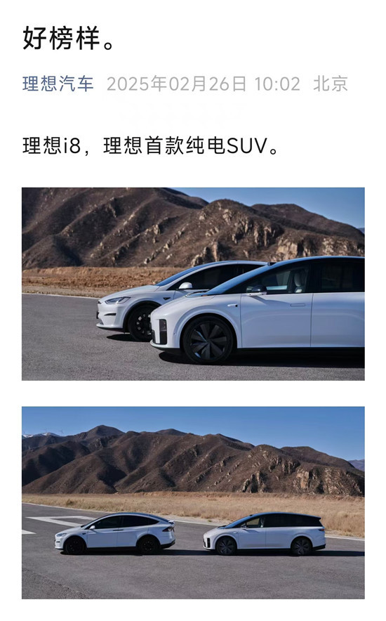 综合官图来看,理想i8前脸融合了理想L序列和理想MEGA的设计语言,整体简洁而富有力量感;车身尾部线条流畅,层次感分明,相较理想MEGA的激进设计更加平和低调。另外,理想i8侧面官图也在随后的2月26日发布。图片中,理想i8与特斯拉Model X同框出现。侧面对比来看,理想i8显得更加厚实与修长。据悉,理想i8定位6座中大型纯电SUV,拥有5C充电技术,主打家庭出行场景,预计售价在30万元以上。