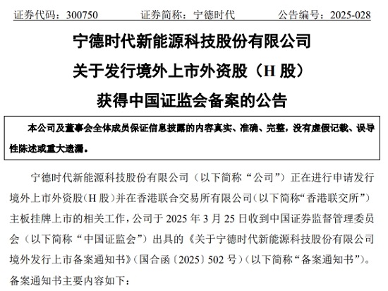 中国经济网3月26日讯(记者 姜智文) 昨日,宁德时代(300750.SZ)宣布取得中国证监会国际司出具的境外发行上市备案通知书,从备案受理至获得通知书仅耗时25天。这标志着宁德时代港股上市进程顺利推进,向着成为“A+H”上市的全球龙头企业迈出坚实一步。