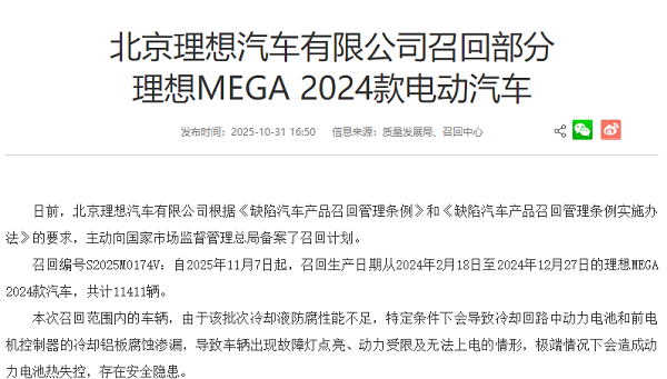 本着对用户安全高度负责、对潜在隐患零容忍的原则,理想汽车主动召回11411辆2024款理想MEGA。“剔除理想MEGA召回预估成本的影响,理想汽车三季度毛利率为20.4%,保持健康水平。”理想汽车方面称。