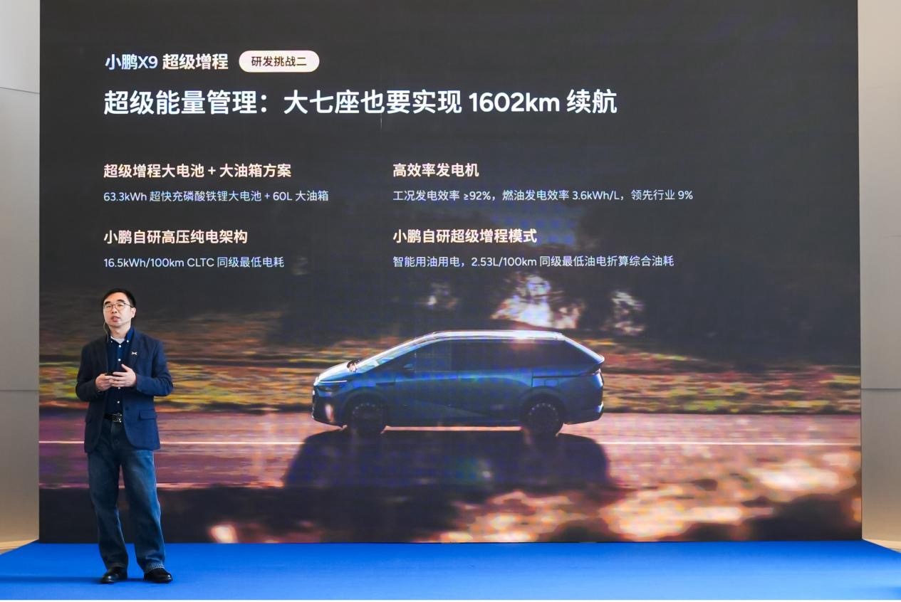第二项挑战是挑战更高效率,以此支撑1602km最长续航。依托小鹏X9超级增程优秀的平台架构和能量管理体系,华为DriveONE全栈高集成高压油冷发电机实现了工况发电效率≥92%、燃油发电效率达3.6kWh/L的水平,配合小鹏自研的高压纯电架构16.5kWh/100km的超低电耗与小鹏自研超级增程模式的2.53L/100km油电折算综合油耗,令小鹏X9超级增程拥有了1602km的综合续航实力。