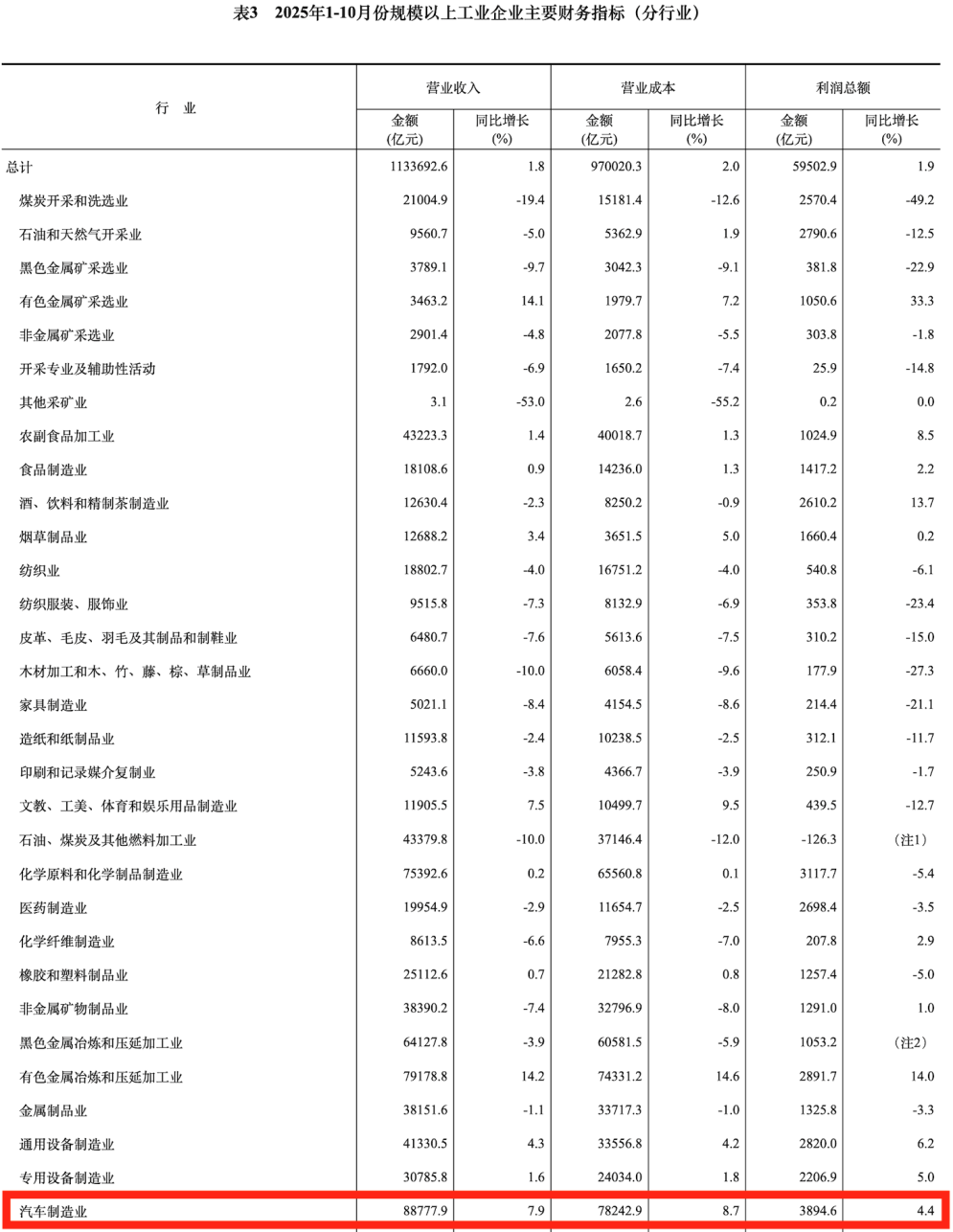 数据更能直观体现趋势变化。在“六十天账期承诺”落实前,1—5月,汽车制造业营业收入41283.3亿元,同比增长7.1%;但利润总额仅1781.4亿元,下滑11.9%,增收不增利特点显著。而据最新数据,1—10月,汽车行业收入88777.9亿元,同比增7.9%;利润总额3894.6亿元,同比增长4.4%,实现营收、利润双增长。(中国经济网记者 郭跃)