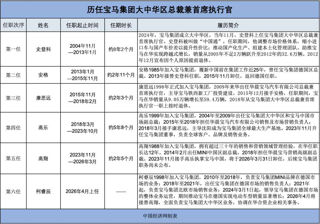 2026年1月30日,宝马集团官宣自4月1日起,柯睿辰(Christian Ach)将接替高翔出任宝马集团大中华区总裁兼首席执行官,高翔将结束在华超过十年的管理任期。