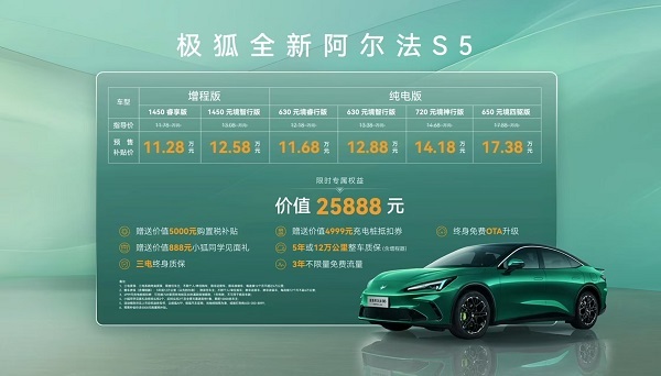 3月1日,极狐全新阿尔法S5预售发布,共推出6款版型,预售补贴后售价11.28万—17.38万元。新车在延续家族轿跑基因的基础上,加推了增程式版本,构建“纯电+增程”双动力布局,搭配全面升级的设计与智能配置,成为极狐在2026年开年的重磅力作。