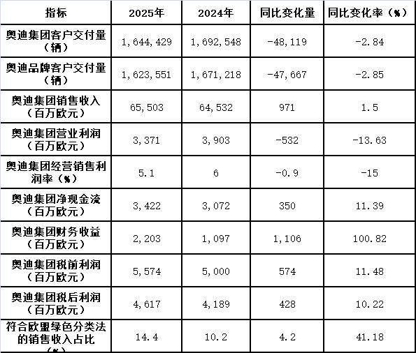 2025财年,奥迪集团核心财务数据呈现“增收微利、现金流走强”的特征:实现销售收入655.03亿欧元,同比增长1.5%;营业利润33.71亿欧元,同比下降13.6%;销售利润率5.1%,同比回落0.9个百分点;净现金流34.22亿欧元,同比提升11.4%;税后利润46.17亿欧元,同比增长10.2%。