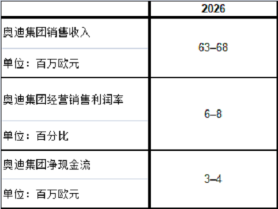 面向2026财年,奥迪释放出明确的盈利修复信号,给出清晰业绩指引:预计销售收入630亿至680亿欧元,经营销售利润率6%至8%,净现金流30亿至40亿欧元。