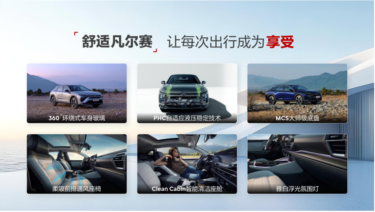 在舒适上,新款凡尔赛C5 X驭不凡版型搭载雅白浮光氛围灯,以柔和雅致的白色光韵勾勒宁静舒缓的座舱氛围,营造出如月光流淌般的温馨与高级感。同时,新增的柔吸前排通风座椅,在座椅的座垫和靠背上布置有通风循环系统,运用高速静音风机产生吸力,源源不断将空气吸入座椅小孔中,有效改善人体与座椅皮面接触部分的空气流通,提升舒适体验。Clean Cabin智能清洁座舱可有效过滤PM2.5,配有空气质量传感器实时监测车外污染物,智能切换内外循环。此外,耀不凡版型配备的铝制车顶行李架,以轻量化高强度的金属质感,既为户外出行拓展了装载空间,又为整车轮廓增添一抹精致的休旅风范。