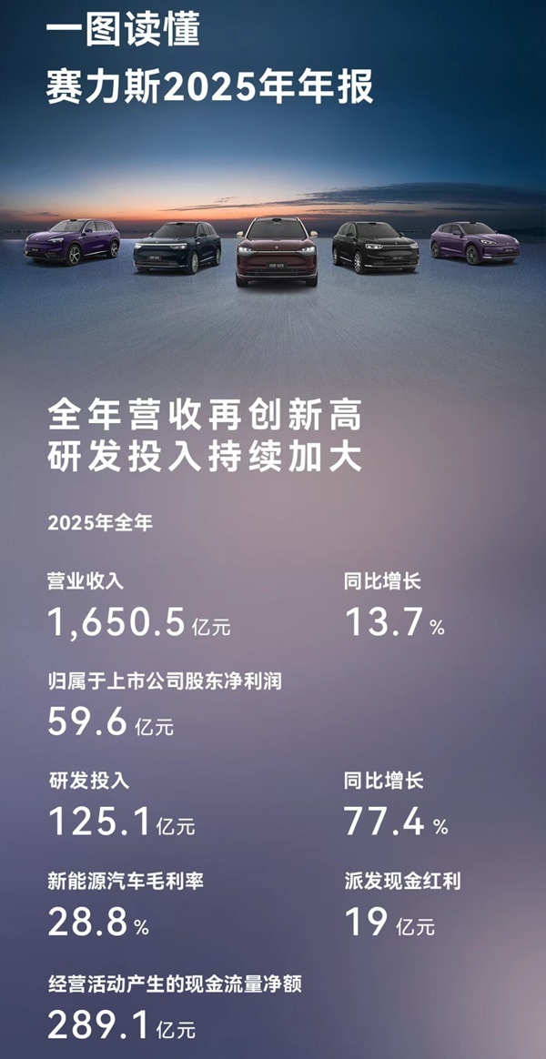 3月30日,赛力斯发布2025年财报显示,公司全年实现营业收入1650.5亿元创历史新高,同比增长13.7%,归母净利润59.6亿元,连续两年实现盈利。同时,公司研发投入125.1亿元,同比增长77.4%,为技术创新与产品迭代提供坚实保障。