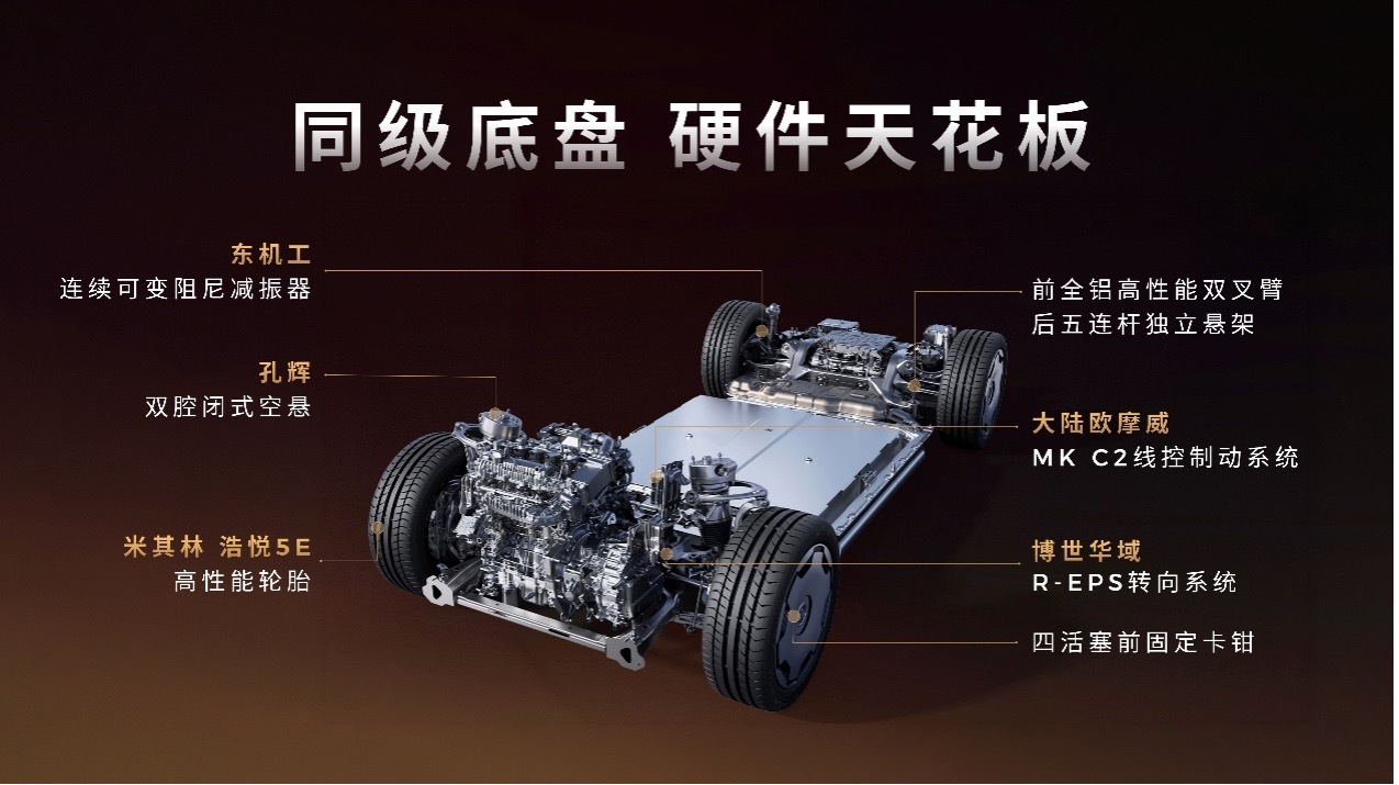 驾控上,零跑D19底盘架构100%自研,搭载前双叉臂、后五连杆独立悬架,经中欧联合专业团队精细化调校,兼顾操控精准与乘坐舒适。纯电版三电机四驱,最大功率540kW、峰值扭矩745N·m,零百加速3秒级,双矢量电驱可实现毫秒级扭矩分配,过弯更稳、加速更强。同时,新车还配备孔辉双腔闭式空气悬架、东机工连续可变阻尼减振器,搭配博世华域R-EPS转向、欧摩威(原大陆)MKC2线控制动、四活塞前固定卡钳和米其林高性能轮胎,硬件规格媲美百万级豪车。