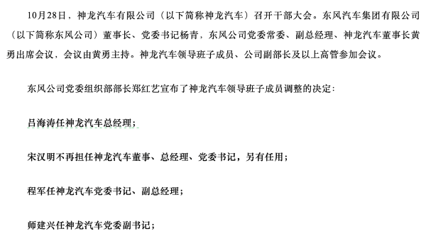 10月28日,神龙汽车有限公司召开干部大会,并宣布了涉及共计5人的公司领导班子成员调整:吕海涛任神龙汽车总经理;宋汉明不再担任神龙汽...